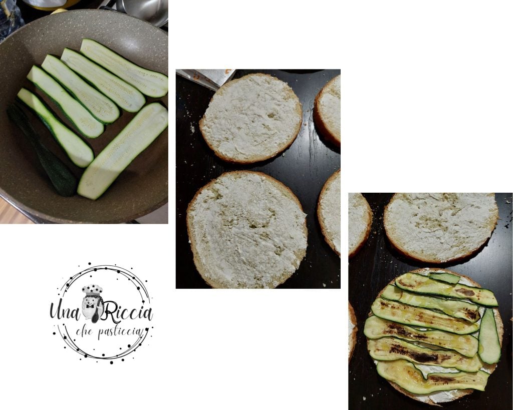 Pegamos a abobrinha, lavamos e cortamos em fatias não finas, depois grelhamos em uma grelha ou frigideira, quando estiver cozida, colocamos em um prato e temperamos com óleo e sal. Espalhamos uma camada de queijo stracchino nas duas fatias da terceira camada e cobrimos com as abobrinhas grelhadas, depois fechamos com a fatia de cima do panetone.