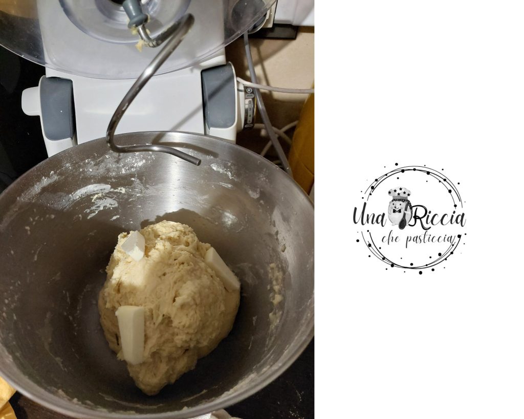 Nesse ponto, começamos a adicionar a manteiga que deve estar mole, enquanto a massa gira em velocidade baixa, inserimos um par de pedacinhos de manteiga de cada vez, sem pressa. Esperamos sempre que o pedacinho anterior esteja completamente absorvido antes de inserir outros. Para esta operação, vão demorar dez a quinze minutos. Quando faltarem poucos pedacinhos de manteiga, inserimos também o sal e continuamos com a parte gordurosa.