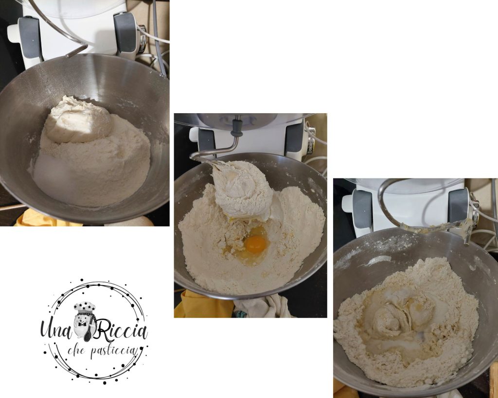 Após o tempo de fermentação, despejamos na tigela da batedeira a farinha manitoba e a farinha 0, juntamos o pré-fermento já fermentado e o açúcar, e começamos a bater sempre com o gancho. Enquanto a massa gira, juntamos os ovos, o leite e o mel. Deixamos girar em velocidade média-baixa até que a massa esteja enrolada no gancho e descolada das laterais da tigela.