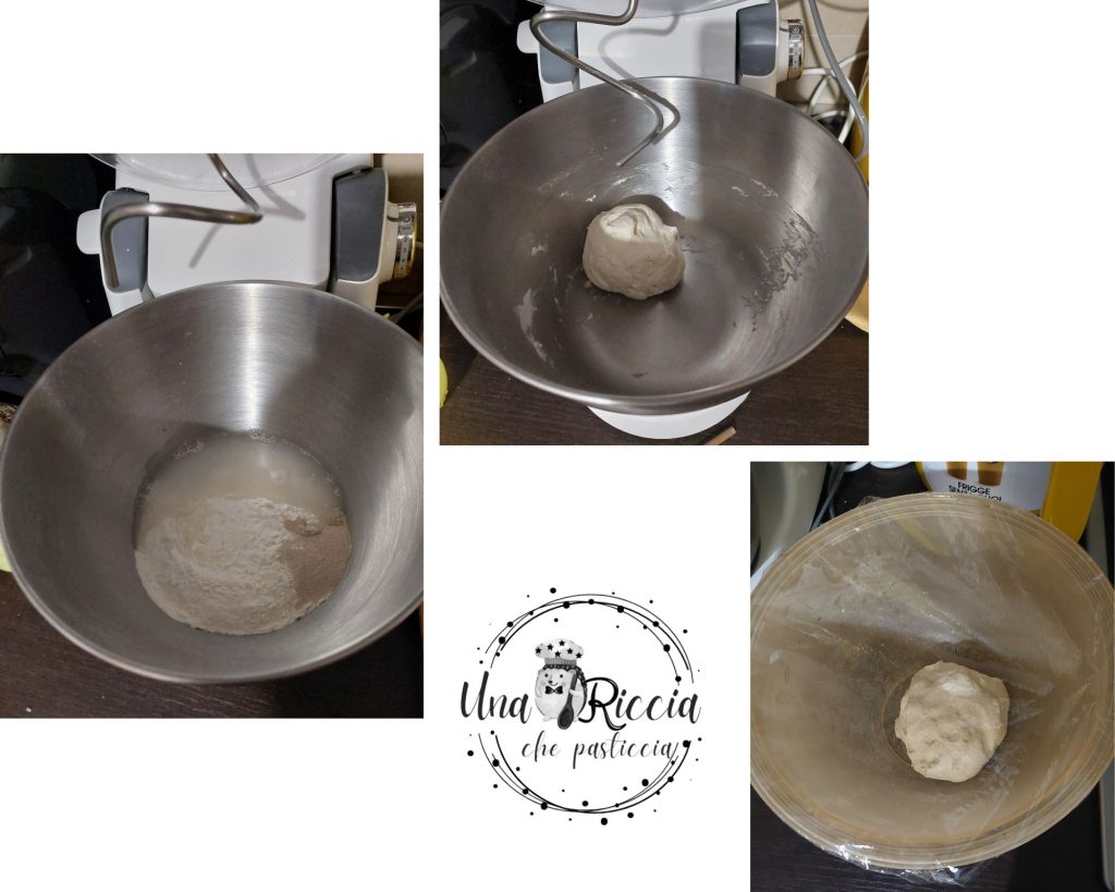 Na tigela da batedeira, colocamos os ingredientes do pré-fermento para criar nosso pré-fermento que dará força à massa final. Assim, colocamos a farinha manitoba, o fermento seco e a água morna, amassamos com o gancho até obtermos uma bola, depois passamos para uma tigela e cobrimos com filme plástico. Deixamos fermentar por uma hora no forno desligado.