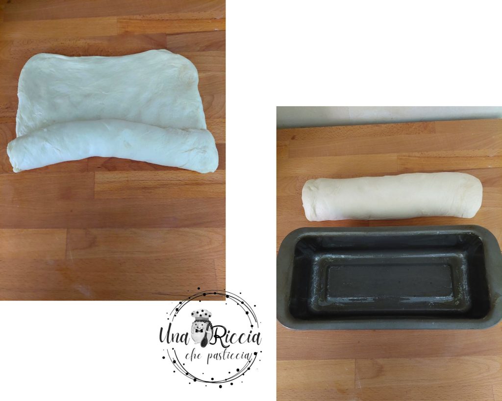 Neste ponto, enrolamos a massa sobre si mesma para dar forma ao pão de forma. Começando por um dos lados curtos, enrolamos até chegar ao outro lado, obtendo assim um rolinho do comprimento da forma de bolo inglês.