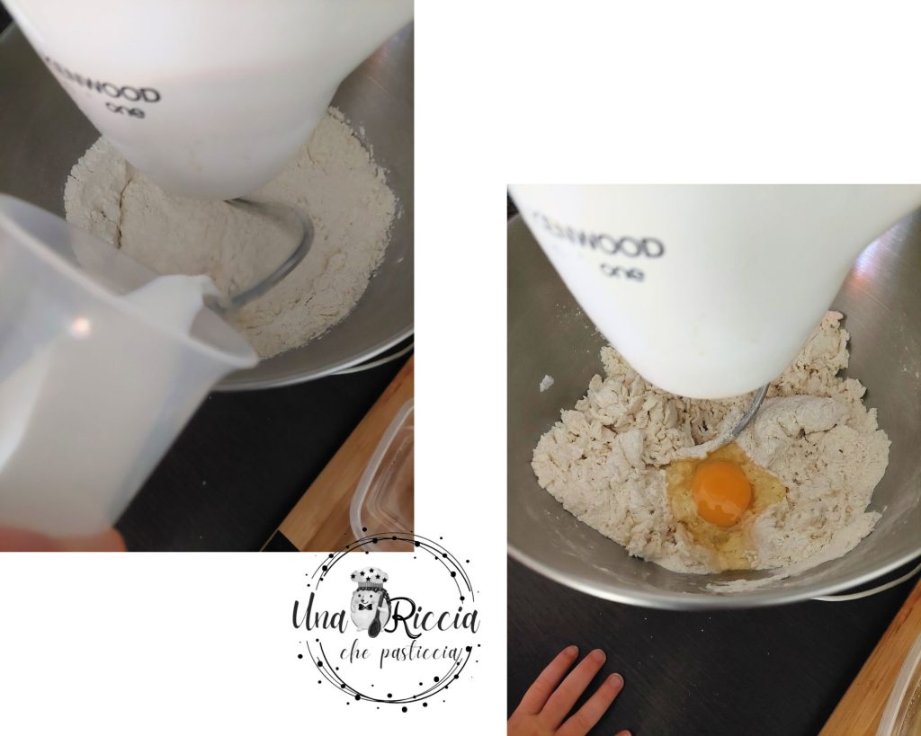 Na tigela da batedeira, colocamos as farinhas misturadas, o fermento biológico seco e o açúcar e começamos a amassar com o gancho em forma de gancho, depois começamos a adicionar o leite aos poucos e, sempre continuando a amassar, adicionamos o ovo.