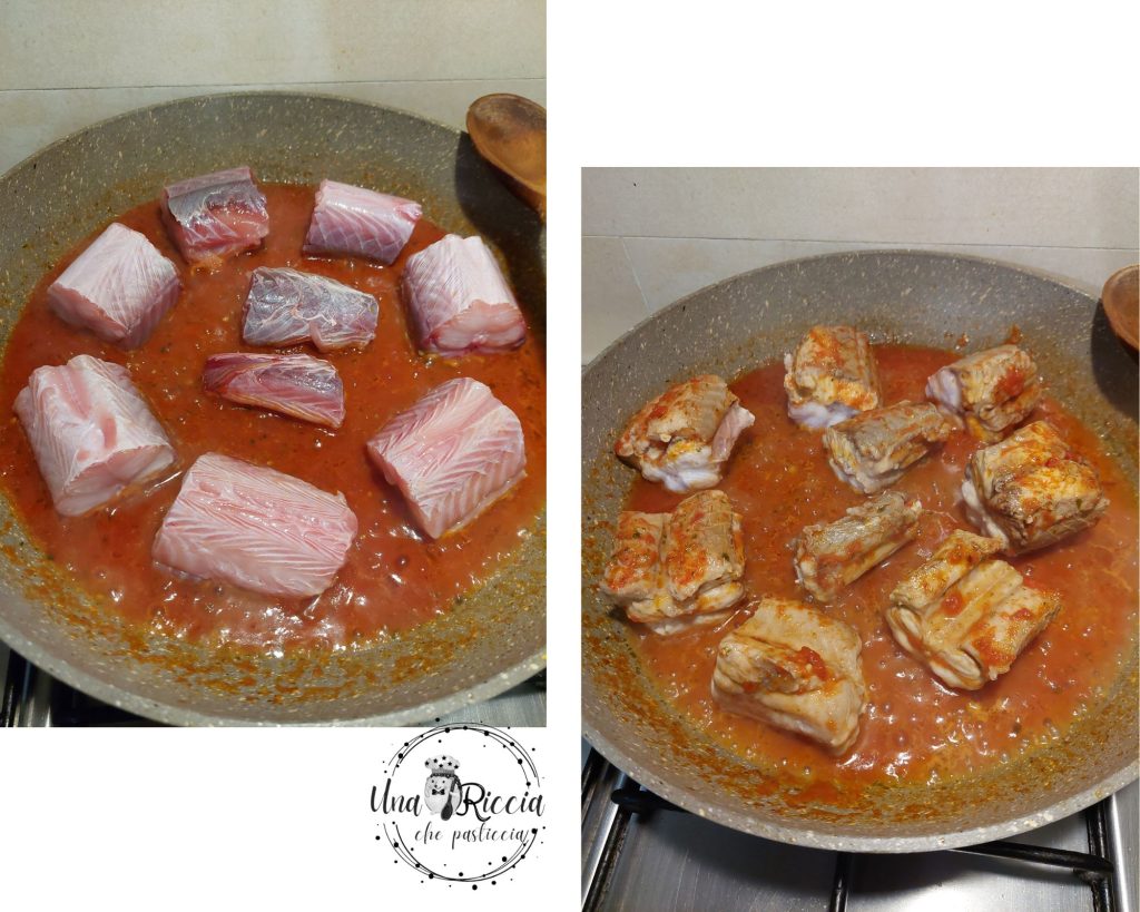 Adicionamos o vinho branco ao molho de tomate e deixamos o álcool evaporar, depois colocamos os pedaços de peixe no molho e deixamos cozinhar por 5/6 minutos. Em seguida, viramos os pedaços de peixe, ajustamos o sal e completamos o cozimento. Se o molho engrossar muito, adicione um pouco de água.