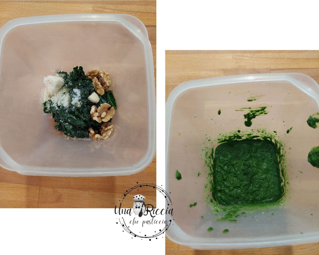 Em um recipiente adequado para o liquidificador de imersão, colocamos a couve escaldada e escorrida e adicionamos o azeite de oliva, o parmesão ralado, o dente de alho, o sal e as nozes. Se desejar, você pode adicionar um pouquinho de pimenta picante. Neste ponto, batemos tudo com um liquidificador de imersão, movendo para cima e para baixo até obter um creme liso. Se o molho estiver muito espesso, podemos adicionar um pouco da água de cozimento da couve.