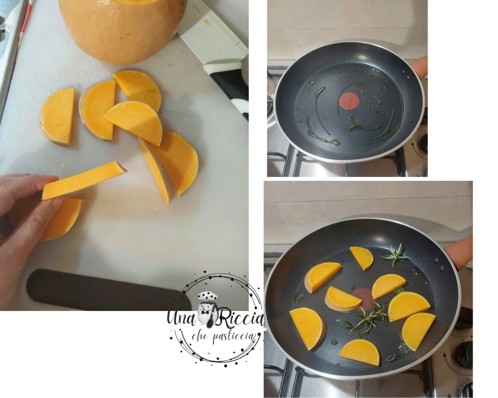 Enquanto o peixe cozinha, cortamos a abóbora em fatias não muito grossas, no máximo 1 centímetro. Em uma frigideira antiaderente colocamos o azeite de oliva e deixamos aquecer ligeiramente, depois colocamos as fatias de abóbora e adicionamos o alecrim e a sálvia. Salpicamos levemente e deixamos cozinhar por alguns minutos, viramos a abóbora e deixamos cozinhar do outro lado.