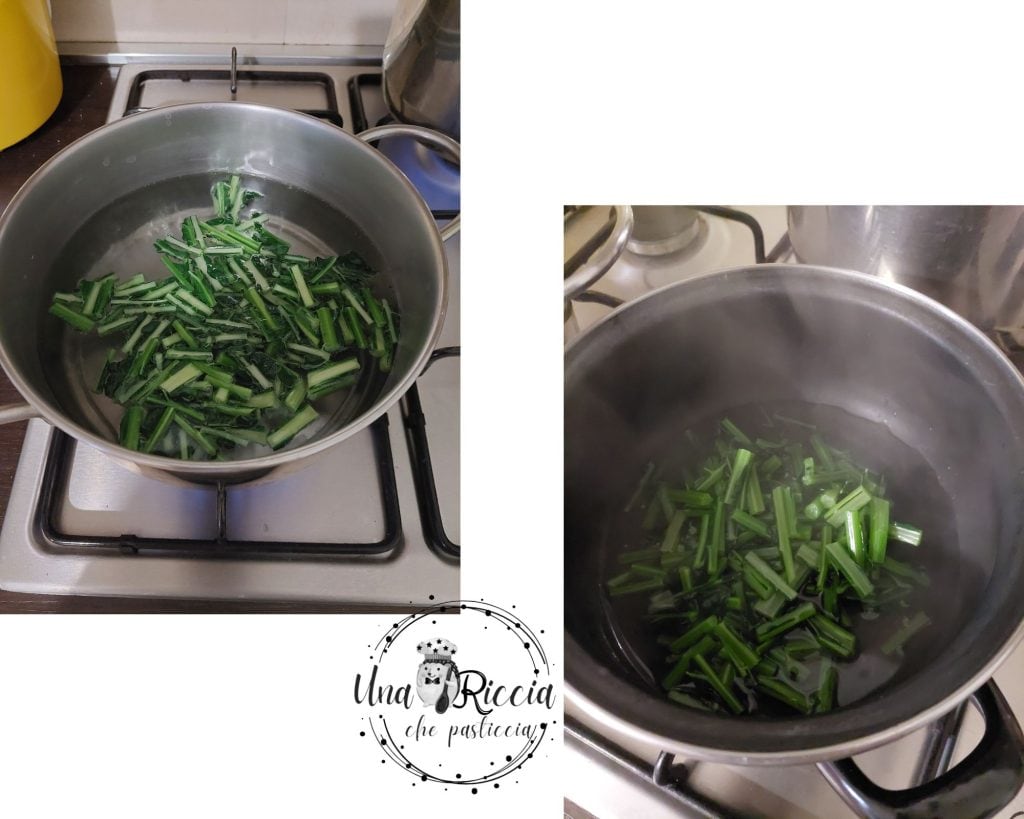 Em uma panela, colocamos um litro de água para ferver. Quando começa a ferver, adicionamos os talos cortados e deixamos cozinhar por cinco ou seis minutos até ficarem macios. Em seguida, escorremos em uma panela e adicionamos dois ou três conchas de caldo de legumes quente.