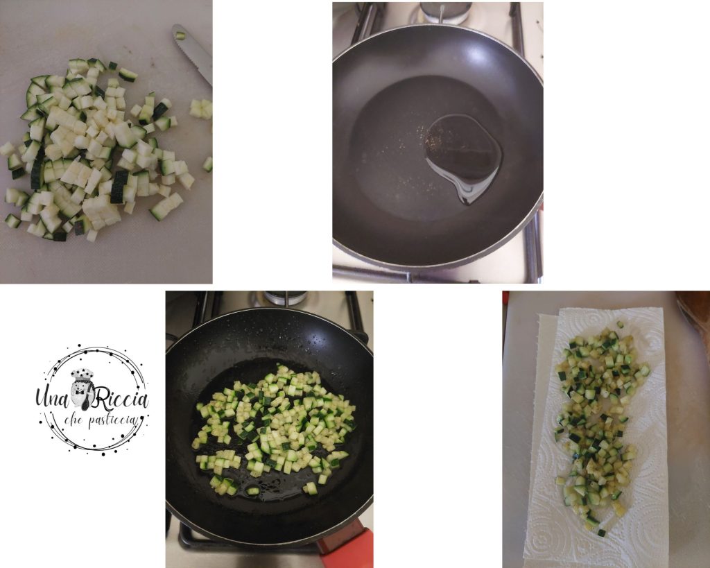 Enquanto a casca da tortinha salgada está assando, cuidamos das abobrinhas. Lave e seque uma abobrinha grande ou duas pequenas, corte em fatias, depois em tiras e faça cubinhos pequenos. Em uma frigideira, adicione um fio de azeite, aqueça levemente e depois adicione as abobrinhas, tempere com sal e deixe cozinhar sem amolecer demais. Quando estiverem cozidas, o que levará 4-5 minutos, retire da frigideira e coloque sobre um papel absorvente para remover o excesso de óleo.