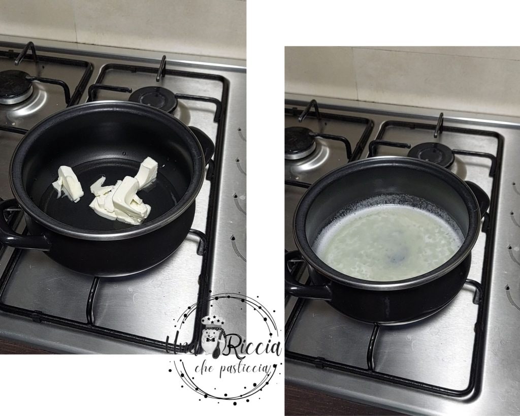 Em uma panela antiaderente, colocamos a água, a manteiga e uma pitada de sal, acendemos o fogo do fogão e quando a manteiga estiver derretida e começarem a aparecer bolhas, abaixamos um pouco a chama, então adicionamos a farinha e o cacau de uma só vez. Mexemos com uma colher de madeira e deixamos cozinhar, sempre mexendo, até que apareça uma película marrom no fundo da panela.