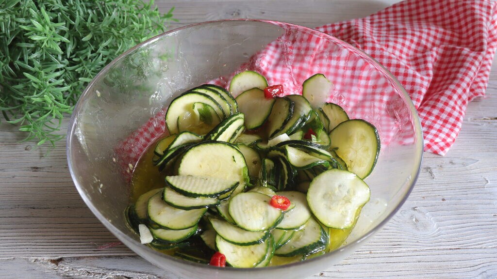 • Misture bem todos os ingredientes e deixe as abobrinhas temperadas descansarem por algumas horas antes de servi-las.