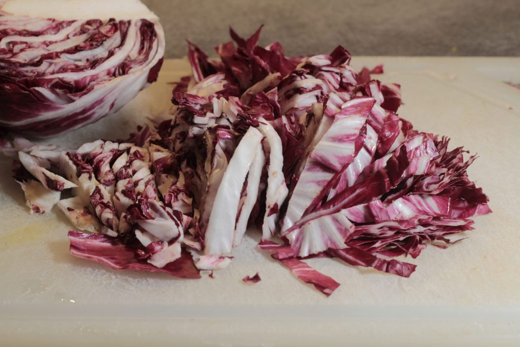 Corte as folhas externas do talo, divida o repolho ao meio e corte em fatias finas. Faça o mesmo com o radicchio.