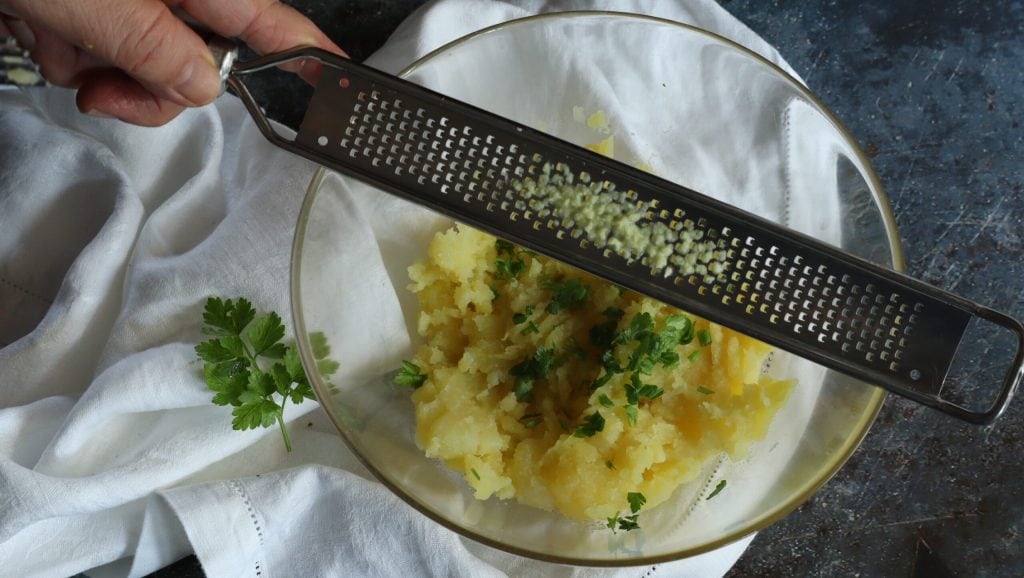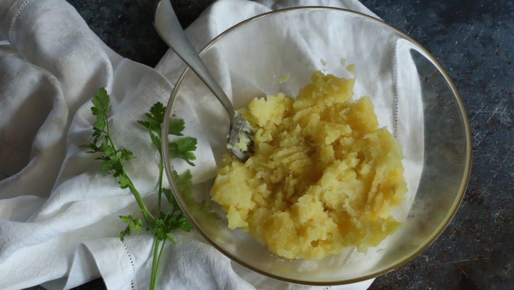 Na tigela coloque as batatas e, depois de descascá-las, amasse-as com o garfo.