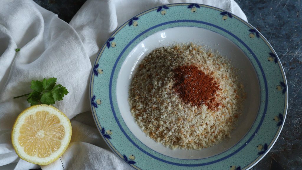 Coloque as batatas para ferver em água fria salgada por 20 minutos, ou cozinhe fazendo furos com os dentes do garfo no prato do micro-ondas por 6 minutos na potência máxima. Enquanto isso, tempere a farinha de rosca com uma pitada de sal e a páprica doce.