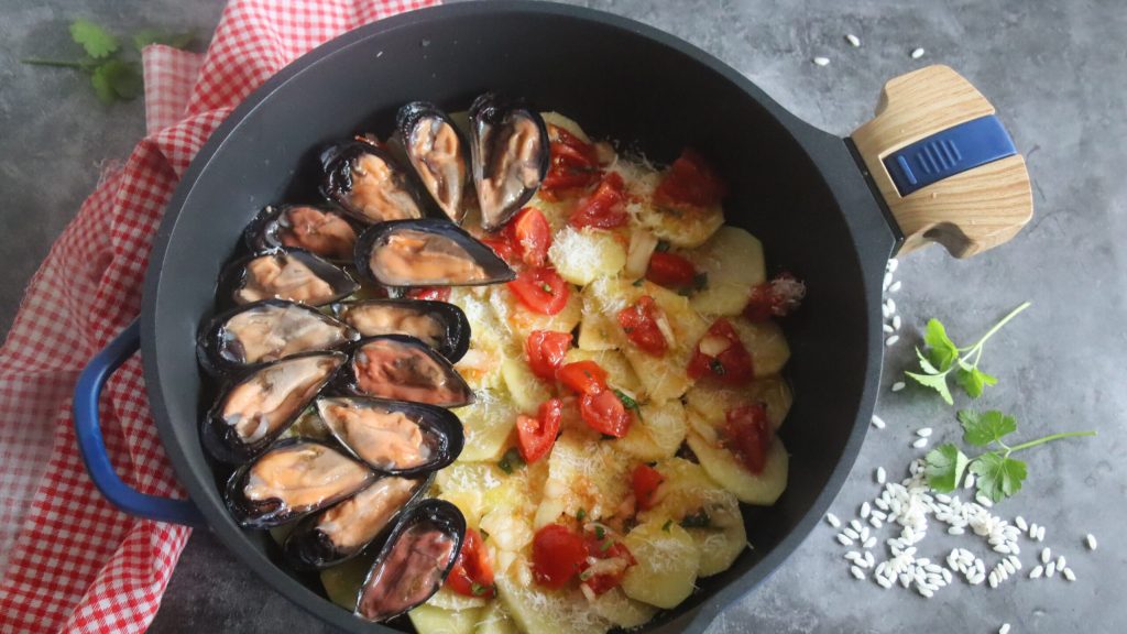 Arroz, batatas e mexilhões: a minha receita super boa, aliás, ótima. Claro, a minha receita, porque cada um tem a sua e certamente é a correta, a original. Tendo recentemente a Fabulosa da Cookut, pensei que esta receita pugliese seja ideal para cozimento no forno porque precisa de cobertura. Não morando no campo e não tendo a panela de barro, pensei nesta panela 8 em 1. Não me enganei: de fato, os sabores, com os aromas do arroz, batatas e mexilhões, ficam selados na panela. Todos os ingredientes cozinham uniformemente, sem secar e sem precisar adicionar mais água durante o cozimento. O melhor período para preparar este prato certamente é o verão. Os meses em que se encontram os mexilhões: de maio a setembro, o período mais quente. No Mar Adriático são mais abundantes. Sem esperar o verão, hoje é possível preparar este prato o ano todo: encontramos mexilhões no comércio e são seguros e controlados. Uma pequena curiosidade, por lei, depois que os mexilhões são colhidos, devem ser deixados no depurador, uma espécie de depuração em água potável por alguns dias. Descubra minha resenha sobre a panela multifunção Versilia de 28 cm 8 em 1 Cookut La Fabuleuse