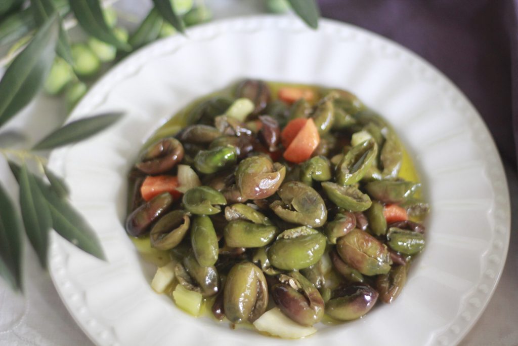 Azeitonas esmagadas à siciliana, fáceis de encontrar se você tiver duas árvores no jardim, caso contrário, compre-as no vendedor de frutas de confiança perto de casa.