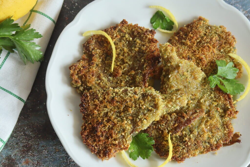 Comece a passar os cogumelos pleurotus nos ovos e logo em seguida na farinha de rosca temperada e aromatizada com salsinha e limão.