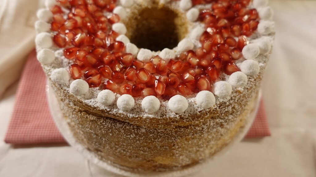 Quando estiver assado, vire a forma com o bolo chiffon, apoiando-a nos pés para esfriar e evitar que abaixe. Decore a gosto com grãos de romã e cachos de chantilly.