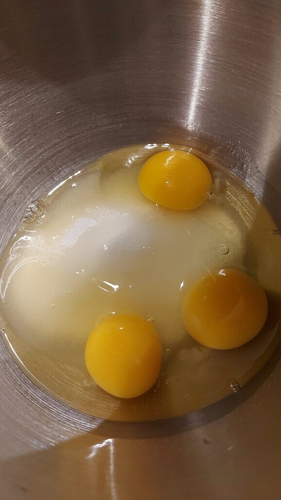 Começamos batendo os ovos com o açúcar, bastante até ficar espumoso.