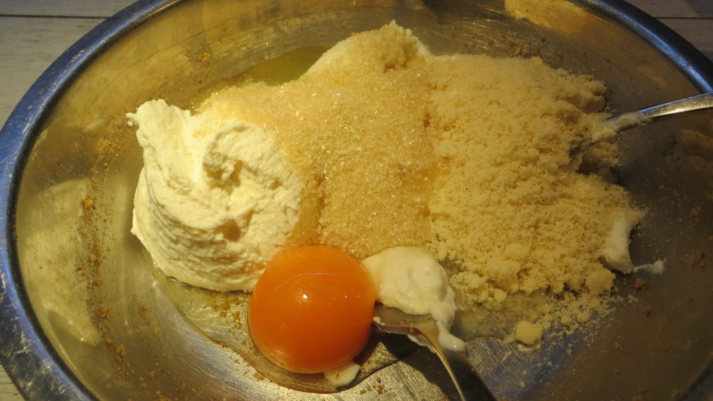 Com o batedor elétrico, preparo o creme com açúcar e ovo, a casca ralada da laranja e com a farinha de amêndoas e ricota.