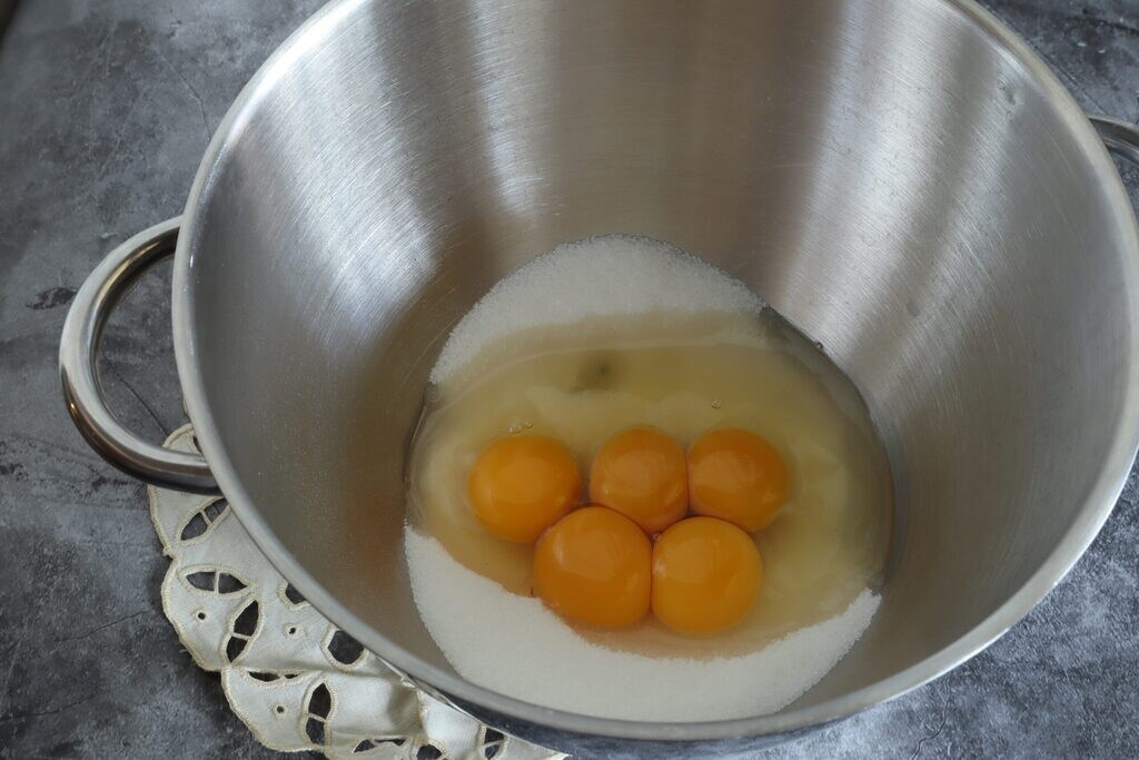 • Na planetária, adiciono o açúcar aos ovos, incluindo as gemas, e bato bem por alguns minutos.