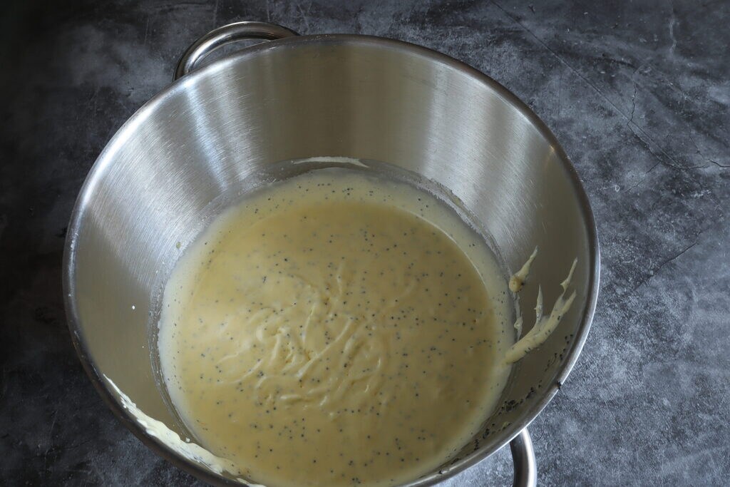 • Adiciono a manteiga com as sementes de papoula e o limão ralado, completo com o leite alternando com a farinha e o fermento.