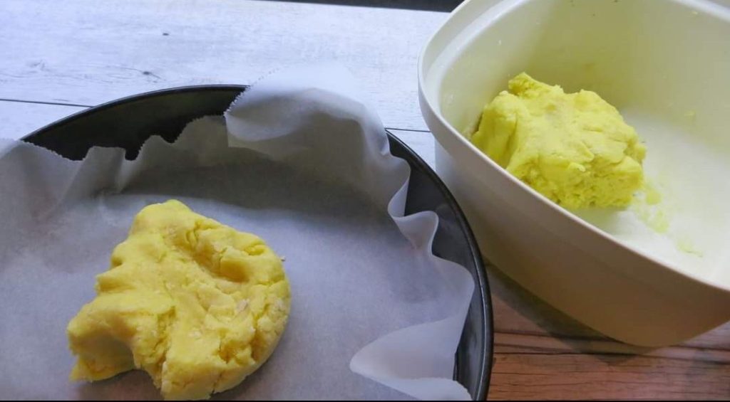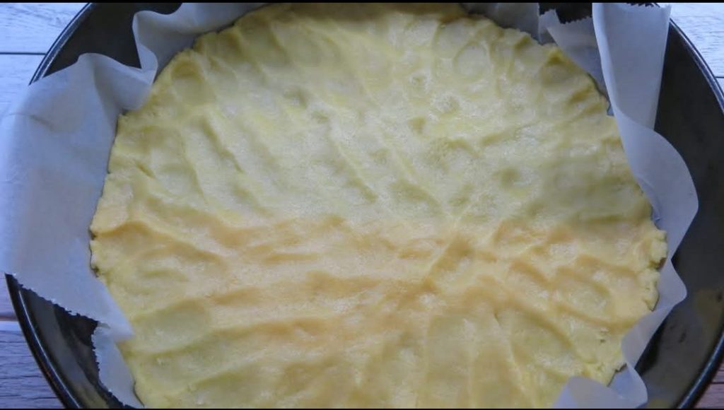 Estendo em uma forma com papel manteiga metade da massa de torta.