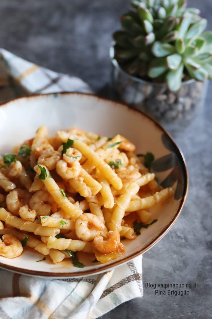 No começo pensei em preparar um prato de spaghetti com camarões, mas encontrei no meu mercado de confiança perto de casa as busiate, uma massa fresca de farinha de sêmola sem ovos, e mudei de ideia na hora. De qualquer forma, mesmo com spaghetti os camarões ficam uma delícia!