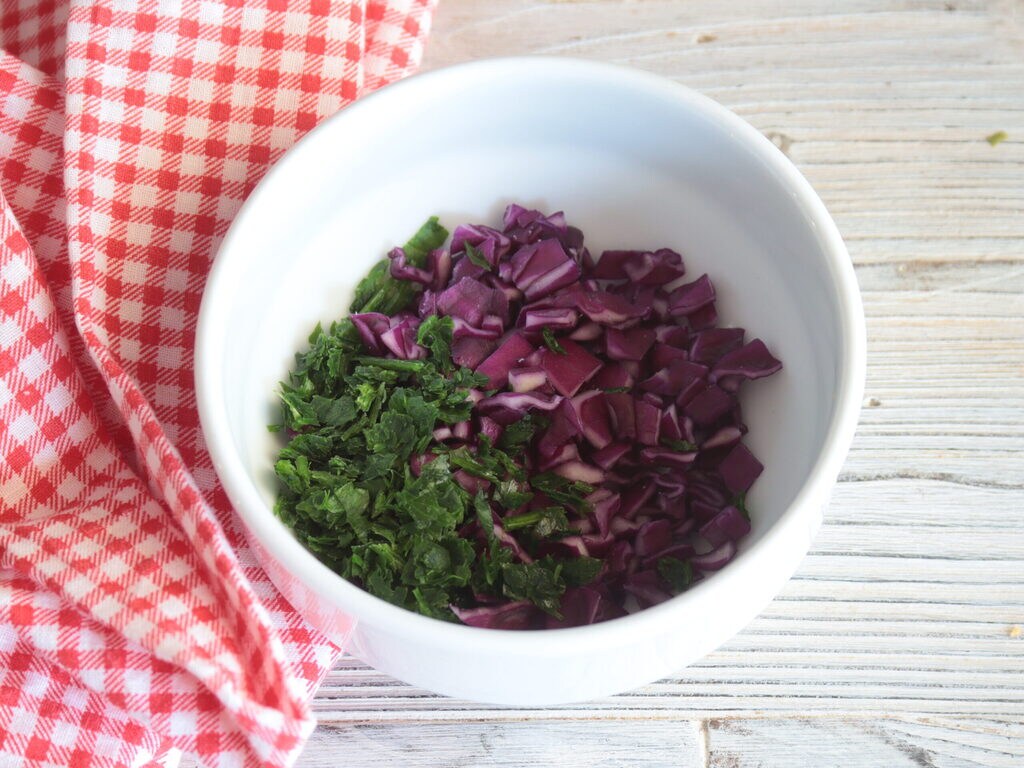 Cortei as fatias de repolho roxo bem finas depois de lavá-las e secá-las muito bem, fiz o mesmo com a salsinha.