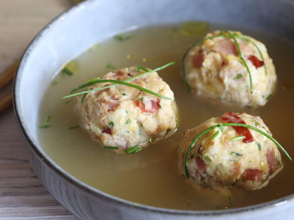 Canederli de speck, uma especialidade clássica italiana, prato tipicamente tirolês, nascido da criatividade e das necessidades do momento como toda a cozinha Ladina. Os romanos, que neste caso eram representados por empregados e soldados, com o seu latim vulgar porque falado diariamente, unindo-se com as línguas nórdicas das Dolomitas, assim nasce o ladino. A cozinha ladina é principalmente preparada com pratos saborosos mas na realidade muito simples, com ingredientes locais a quilômetro zero, do momento absolutamente, aquilo que a terra dá naquela estação. Entre Trentino, Vêneto e Alto Ádige nessas partes das Dolomitas ainda vigora a cultura ladina e, portanto, a gastronomia como alguns pratos típicos, veja o strudel de maçã ou as sopas de cevada, ou ainda os bolinhos fritos com um recheio de ricota e espinafre, existem também os canederli de speck com pão amanhecido que hoje, de forma imprópria, como siciliana, prepararei com amor como todos, indistintamente, os meus pratos.