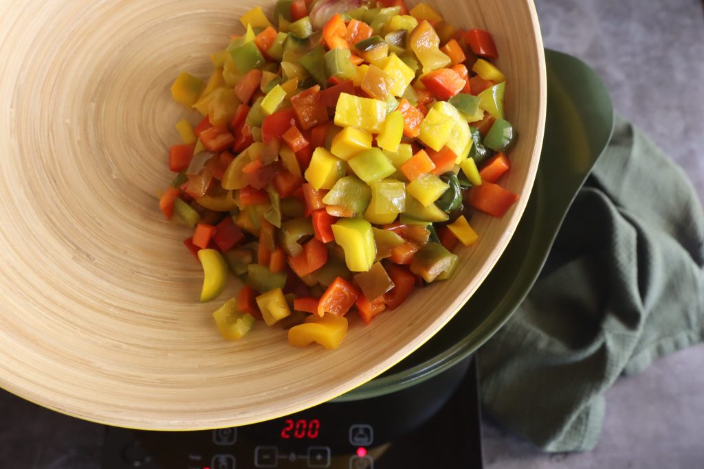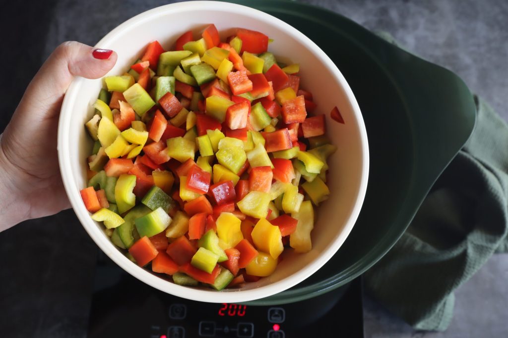 • Depois de lavar os pimentões, prossigo com o cortador de legumes, recém-adquirido, para cortá-los em pedaços grandes em menos de cinco minutos.