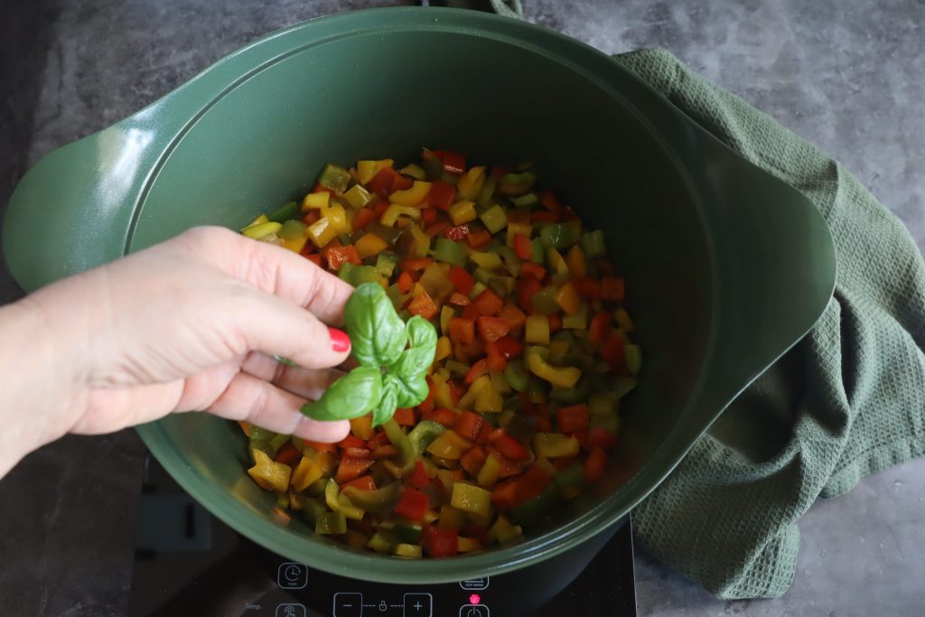 Caponata de legumes com Incrível Cocotte, a panela por excelência para cozinhar de forma saudável e sustentável, porque cozinhar em casa é saudável e sustentável. A caponata é um acompanhamento típico da culinária tradicional siciliana, que pode ser feita apenas com berinjelas ou com legumes variados como pimentões e abobrinhas. Este prato é preparado em agridoce ou simplesmente na frigideira com todos os legumes refogados. Atualmente, comprei um utensílio de cozinha que corta todos os legumes em cubos (em dois tamanhos, se desejar). Com isso, consegui agilizar o tempo de preparação da caponata. Nesta receita, o protagonista é certamente o manjericão, fresco e da estação, que junto com os pimentões e as berinjelas realça os aromas e sabores do verão.