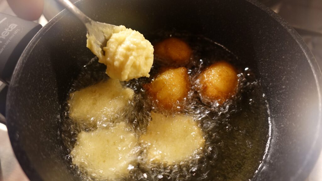 Coloque o óleo de amendoim em uma panela pequena e comece a fritar as castagnole de ricota sem glúten. Ajude-se com uma colher de chá.