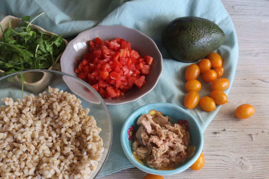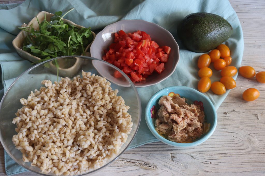 Lave várias vezes a cevada perolada e coloque para cozinhar em água fria e, assim que começar a ferver, conte cerca de 30 minutos. Enquanto isso, lave os tomatinhos amarelos e os vermelhos e corte-os em pedaços pequenos. Faça o mesmo com a rúcula: lave bem e, após secar, corte em várias partes. Divida o abacate ao meio e retire o caroço de dentro, corte a polpa toda em pedaços pequenos e reserve. Assim que a cevada estiver pronta, escorra e deixe esfriar antes de misturar todos os ingredientes frescos. Não escorra o atum do óleo de conservação porque será somente ele, junto com o abacate, o tempero da cevada perolada.