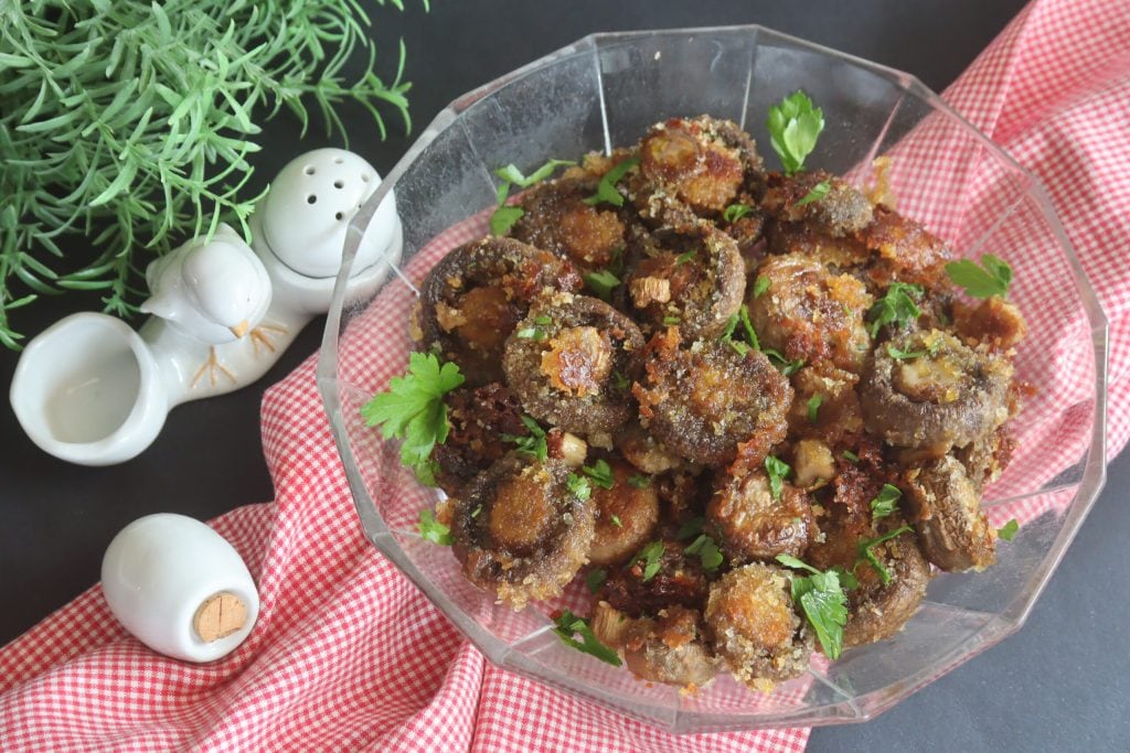 • Corto o talo dos cogumelos e os disponho na assadeira com papel manteiga, incluindo os talos, tempero com sal e azeite de oliva extra virgem, pão ralado e salsinha.