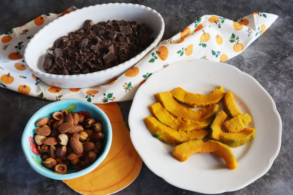 Você pode usar gotas de chocolate se quiser. Eu usei chocolate amargo e cortei com a faca sem uma forma precisa. Cozinhei a abóbora no micro-ondas por 12 minutos, mas existem diferentes possibilidades de cozimento. Você pode cozinhá-la no vapor, na fritadeira a ar ou na frigideira com meio copo de água por 20 minutos.