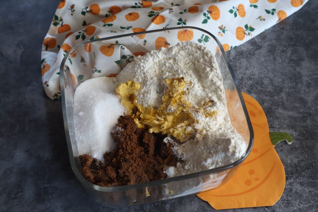 Na tigela de vidro, misture a farinha com os dois tipos de açúcar, o fermento e a pitada de bicarbonato. Adicione a manteiga com a abóbora e, por último, as amêndoas, as avelãs e o chocolate em pedaços.