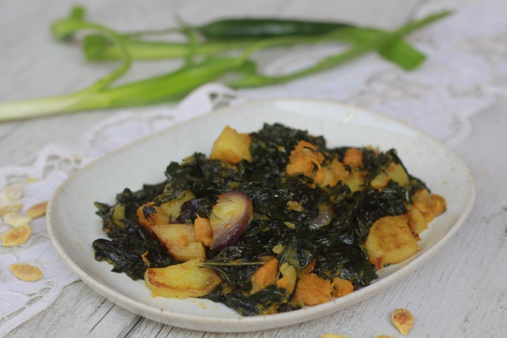 Enquanto isso, coloque na frigideira a couve negra com a cebola em fatias, o azeite e o sal, deixe cozinhar com a tampa por 20 minutos. Retire a tampa e deixe secar a água de cozimento que se formou.