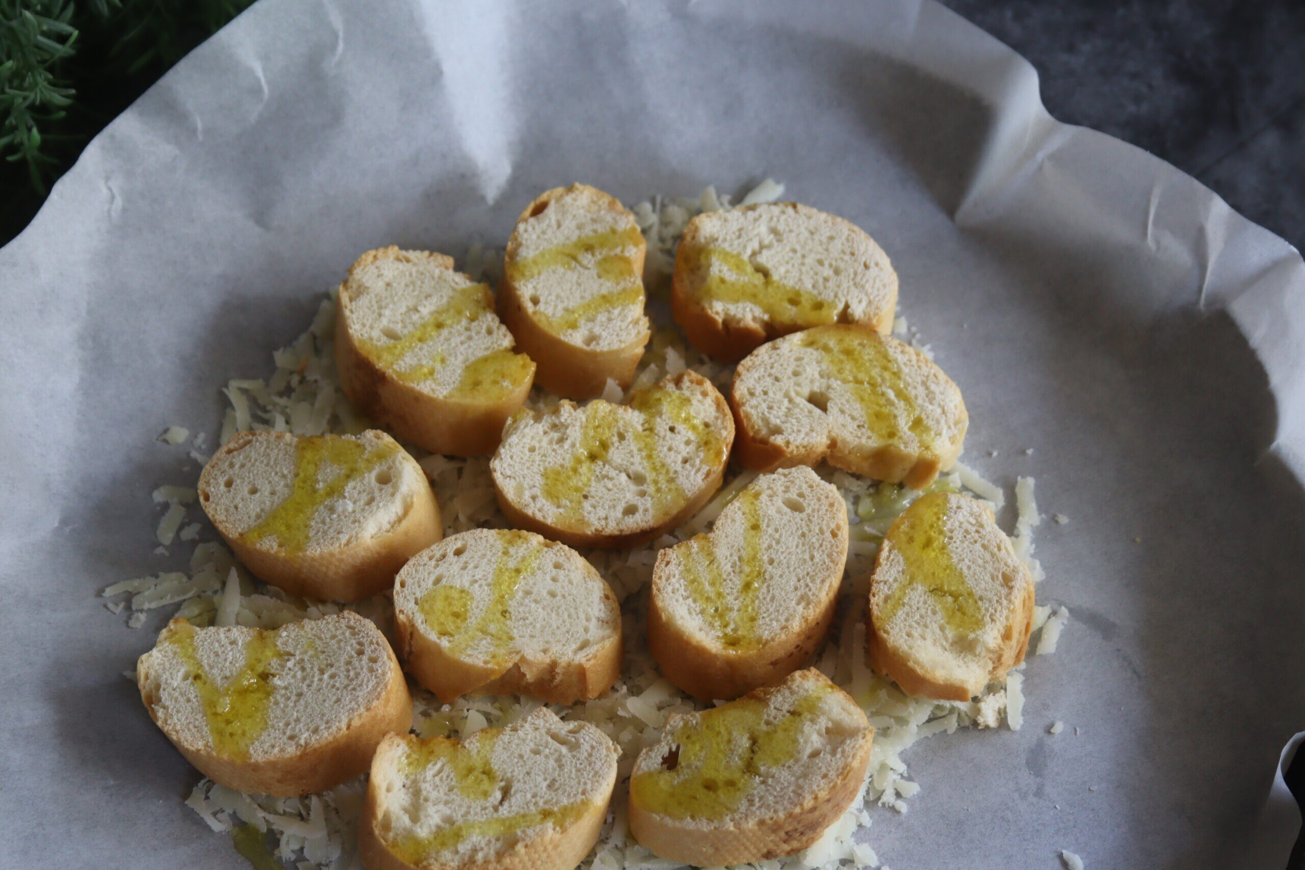 Corte a baguete em fatias de 1 centímetro e meio e coloque-as sobre o pecorino no papel manteiga (não esqueça a pimenta preta moída).