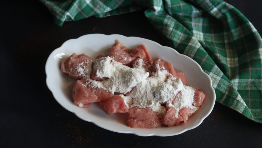 Enfarinhe levemente a carne em pedaços.