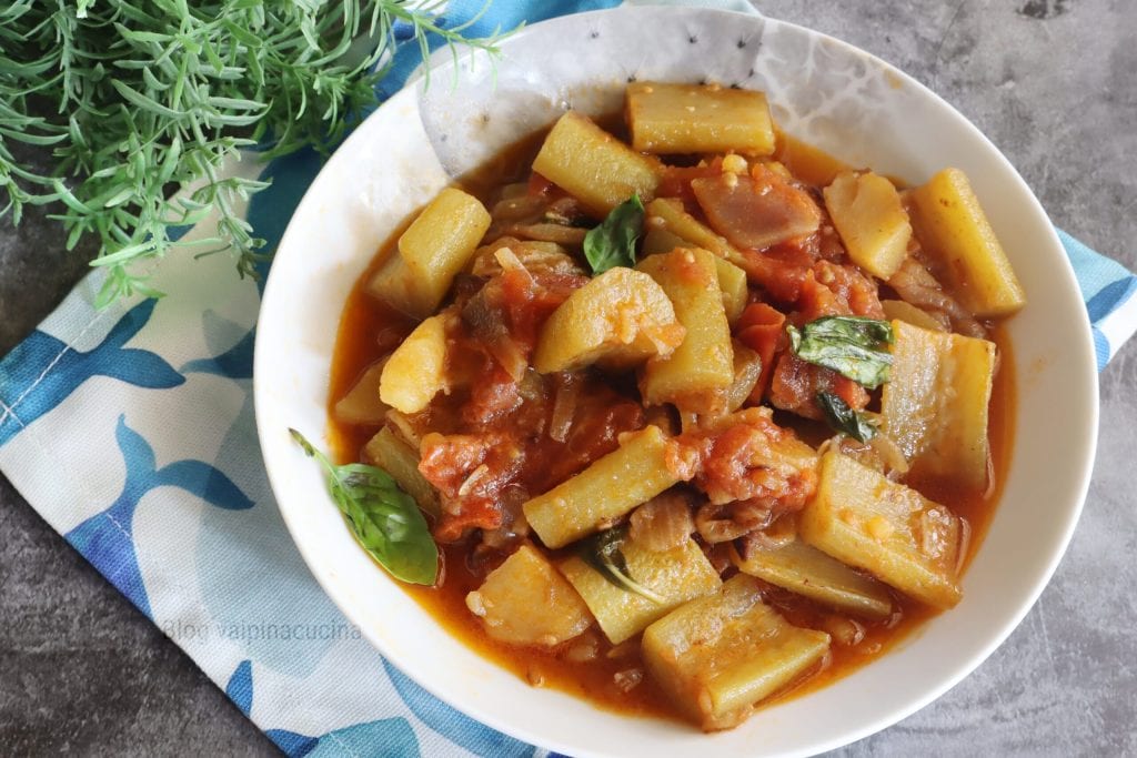 Ensopado de abobrinha longa siciliana com cebolas, batatas e tomates frescos, tudo cortado de maneira grosseira. Uma forma diferente de cozinhar a cucuzza longa ou abobrinha trombetta, uma variedade de abobrinha que é produzida nesta época do ano e principalmente no Sul da Itália, como na Sicília, por exemplo. Uma maneira rústica de preparar a abobrinha longa com pedaços bem grandes e cozidos todos juntos. Digo a verdade: é realmente difícil encontrá-la em mercadinhos ou hortifrutis na capital. Pelo menos, eu falo dos lugares que frequento e onde vivo.