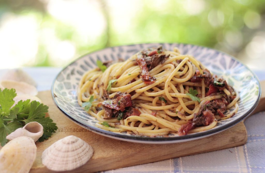 Espaguete com a buzzonaglia, talvez nem todos estejam cientes desta iguaria totalmente siciliana. Certamente, porém, já sabem que sou siciliana, então para mim voltar para casa, (mesmo que a 700 quilômetros de distância) é também me abastecer de produtos típicos, um costume, um pouco como levar um pedacinho da minha Sicília. A buzzonaglia de atum é um pouco como falar dos restos “do porco não se joga fora nada”, a mesma coisa, do atum não se joga fora nada: isso é a buzzonaglia. Os espaguetes com a buzzonaglia são um concentrado de sabor intenso mas delicado ao mesmo tempo, como os meus espaguetes, que com a adição de tomatinhos frescos e tomates secos, vos asseguro uma bondade única.