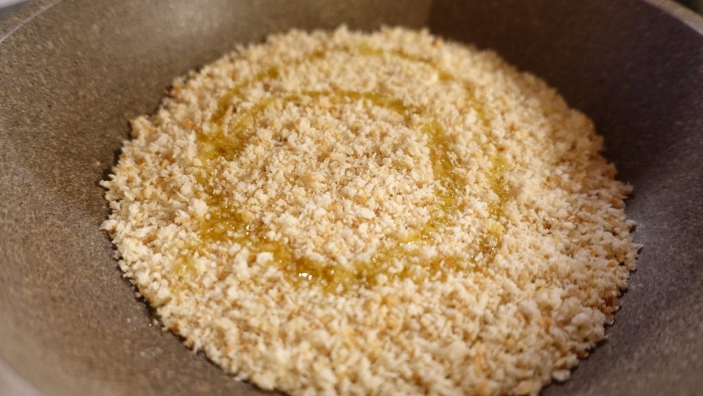 Enquanto isso, passe na frigideira com azeite, o pão ralado e torre-o.