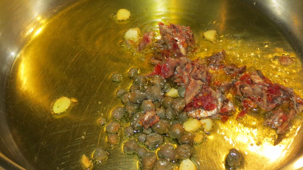 Coloque a água para cozinhar o macarrão e, enquanto isso, em uma panelinha doure o dente de alho com a pimenta vermelha, as anchovas e as alcaparras.
