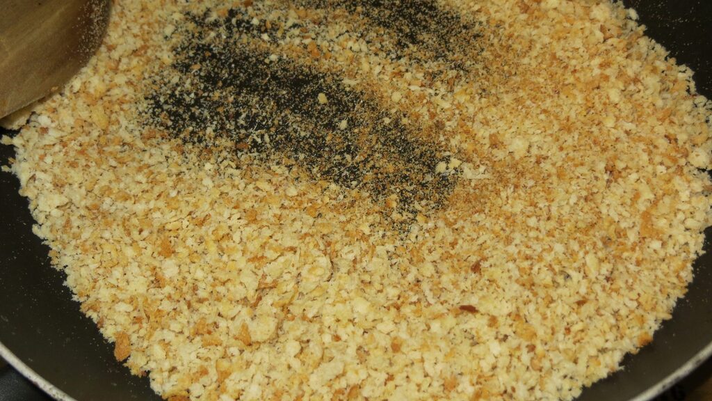 Em uma panelinha antiaderente, toste as migalhas de pão, não precisa adicionar óleo.