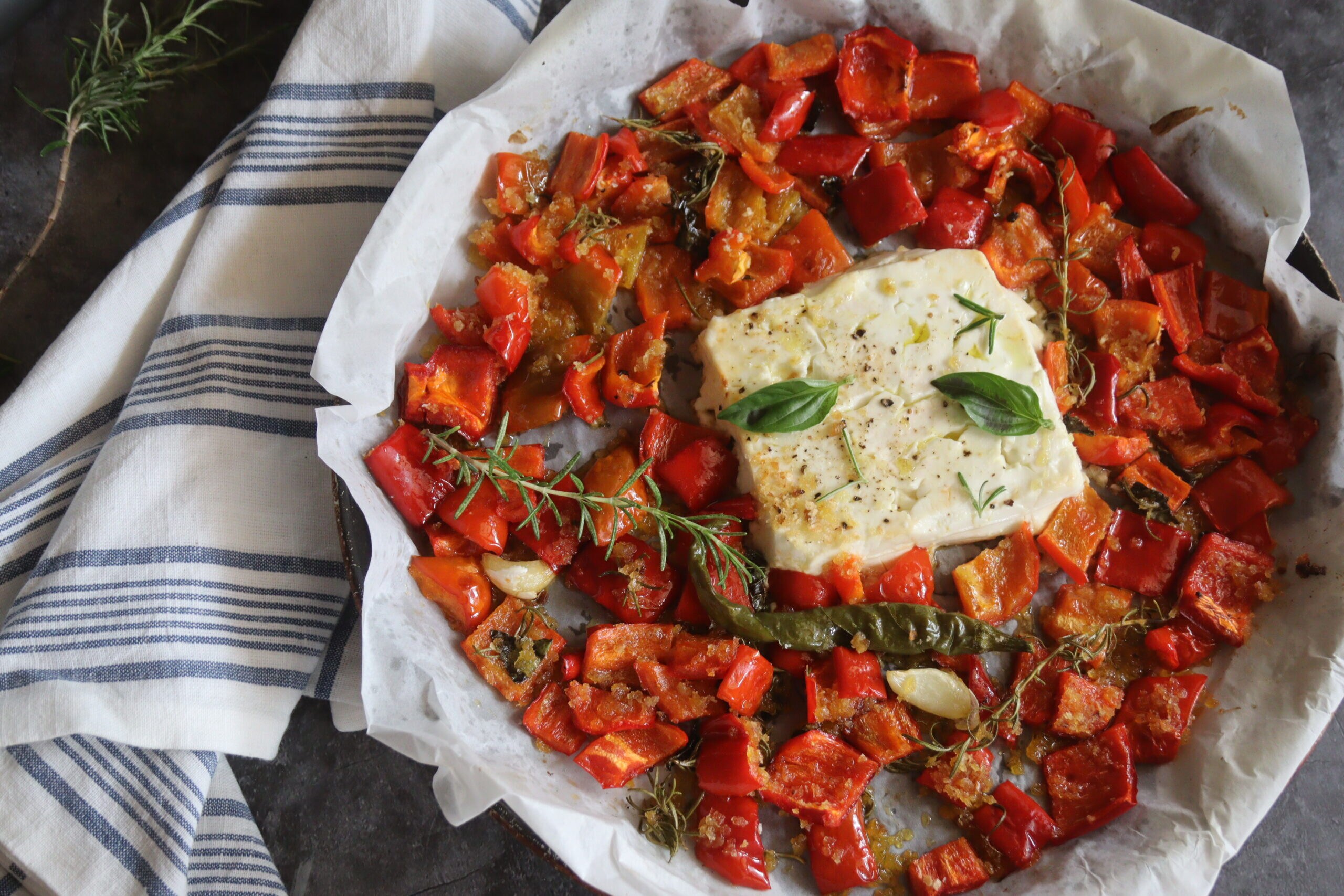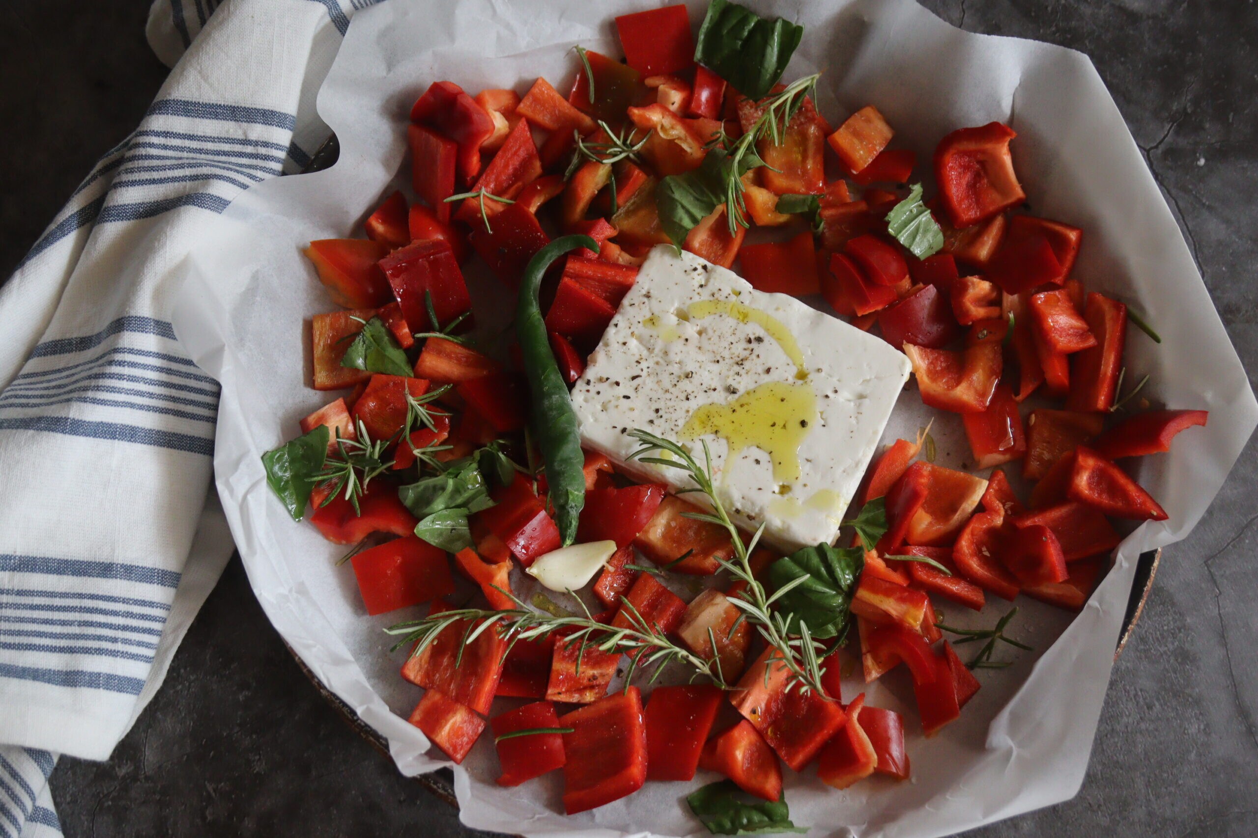 • Lave os pimentões e retire as sementes e o caule, corte-os em pedaços e coloque-os em uma assadeira com papel manteiga, adicione a feta e tempere tudo com temperos, sal e pimenta, azeite e farinha de rosca.