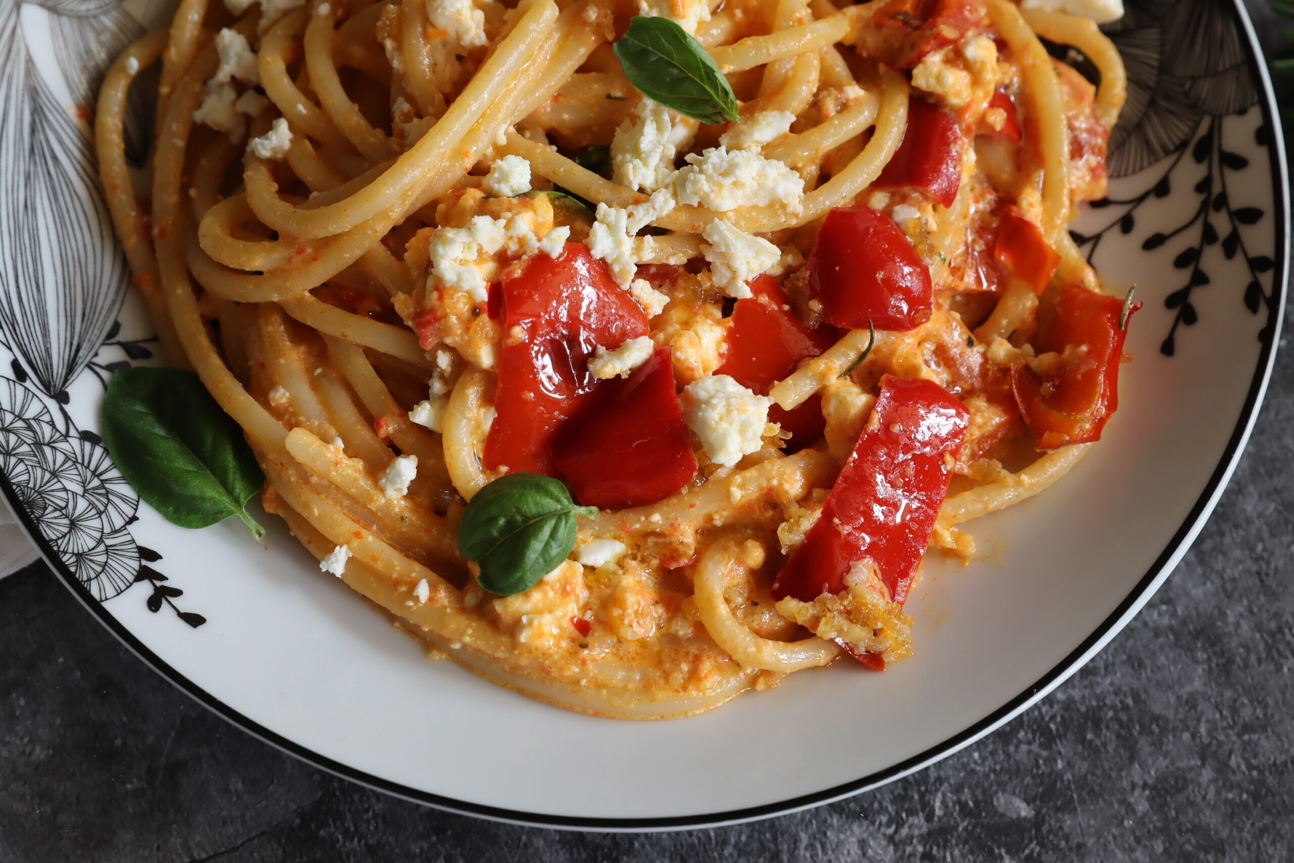 Espaguete com pimentão e feta ao forno, como não combinar essa maravilhosa salsa com espaguete? Eu tinha que fazer isso, a cremosidade e a doçura dos pimentões assados com migalhas de pão e feta com vários temperos completam esta fantástica receita. Até mesmo num domingo, um primeiro prato com essa salsa é o almoço servido, fresco e leve com produtos rigorosamente sazonais, o emblema do verão, os pimentões assim como as berinjelas.