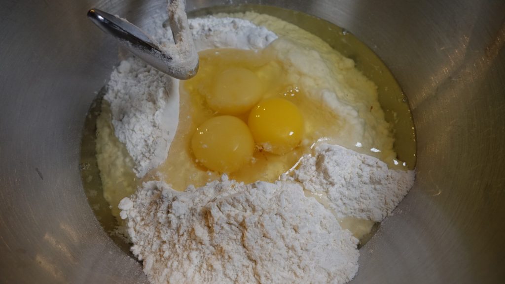 Na batedeira, coloque a farinha com o sal, ligue e adicione os ovos, se perceber que é necessário, adicione uma xícara de água.