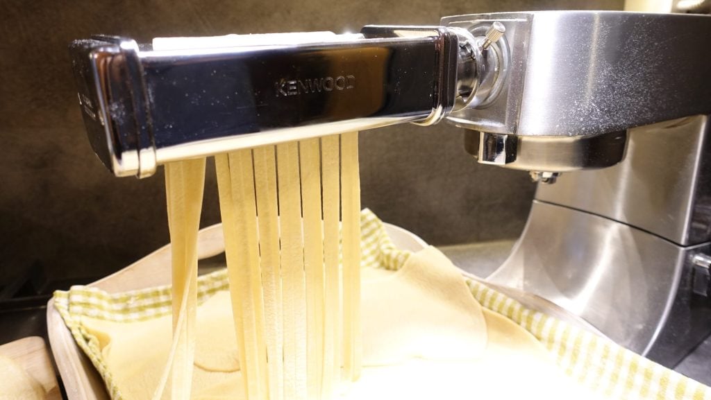 Se em casa você não tiver uma batedeira planetária disponível, pode tranquilamente trabalhar a massa de ovos e farinha para preparar as fettuccine também à mão. Um bom esforço a mais, mas fique tranquilo que o resultado final não muda.
