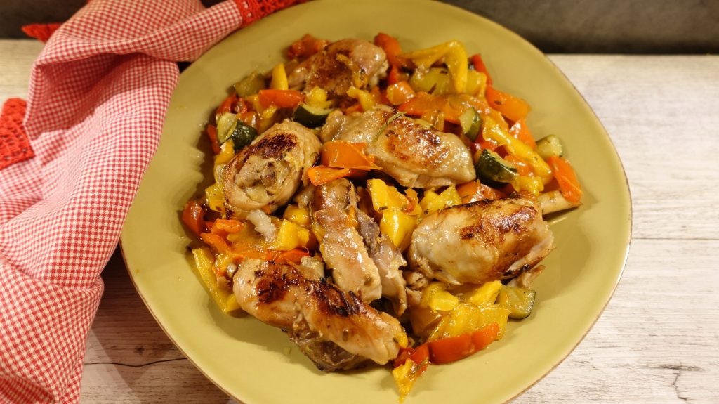 O frango com pimentões é um prato principal simples de preparar e com poucos ingredientes: apenas dois, digamos principais, obviamente é necessário adicionar os vários temperos de acordo com os hábitos e a própria receita. O frango com pimentões, hoje em dia, é difundido em todas as partes da Itália, mesmo que as origens sejam do Lácio. Prato típico das áreas rurais de Roma, costuma-se preparar para a festa de 15 de agosto, mas qualquer dia do ano é sempre bom para cozinhar e oferecer aos amigos, alegrando a mesa com suas cores. Hoje quis experimentar o meu frango com pimentões de forma mais leve e rápida. Gostei muito da ideia de usar a panela de pressão para acelerar o tempo de cozimento e usar menos gordura. Então, mudei a minha receita, agora vou te contar como.
