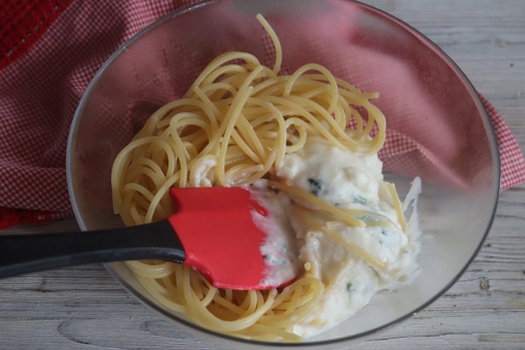 • Cozinhei os spaghettoni al dente e os misturei com o molho bechamel.
