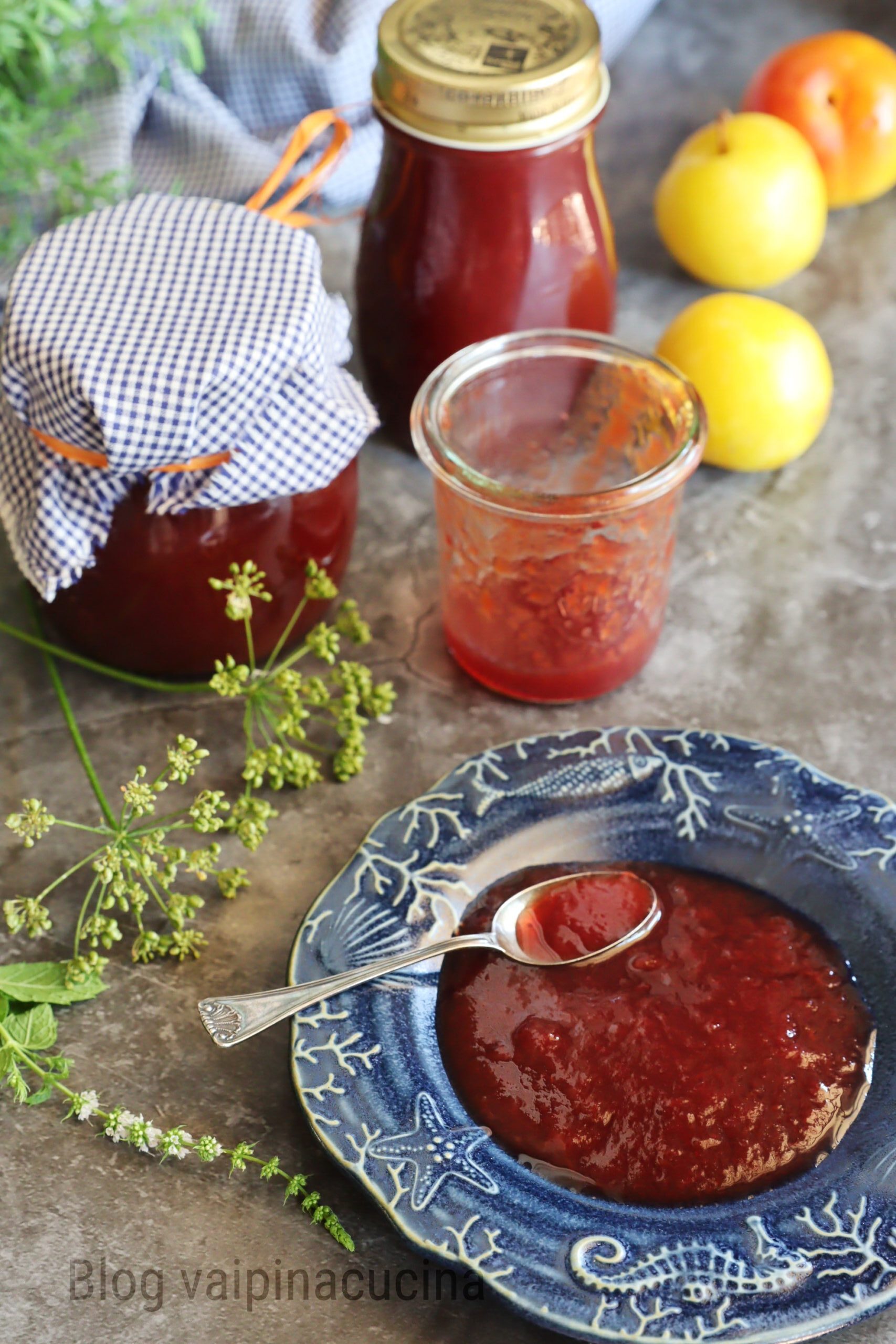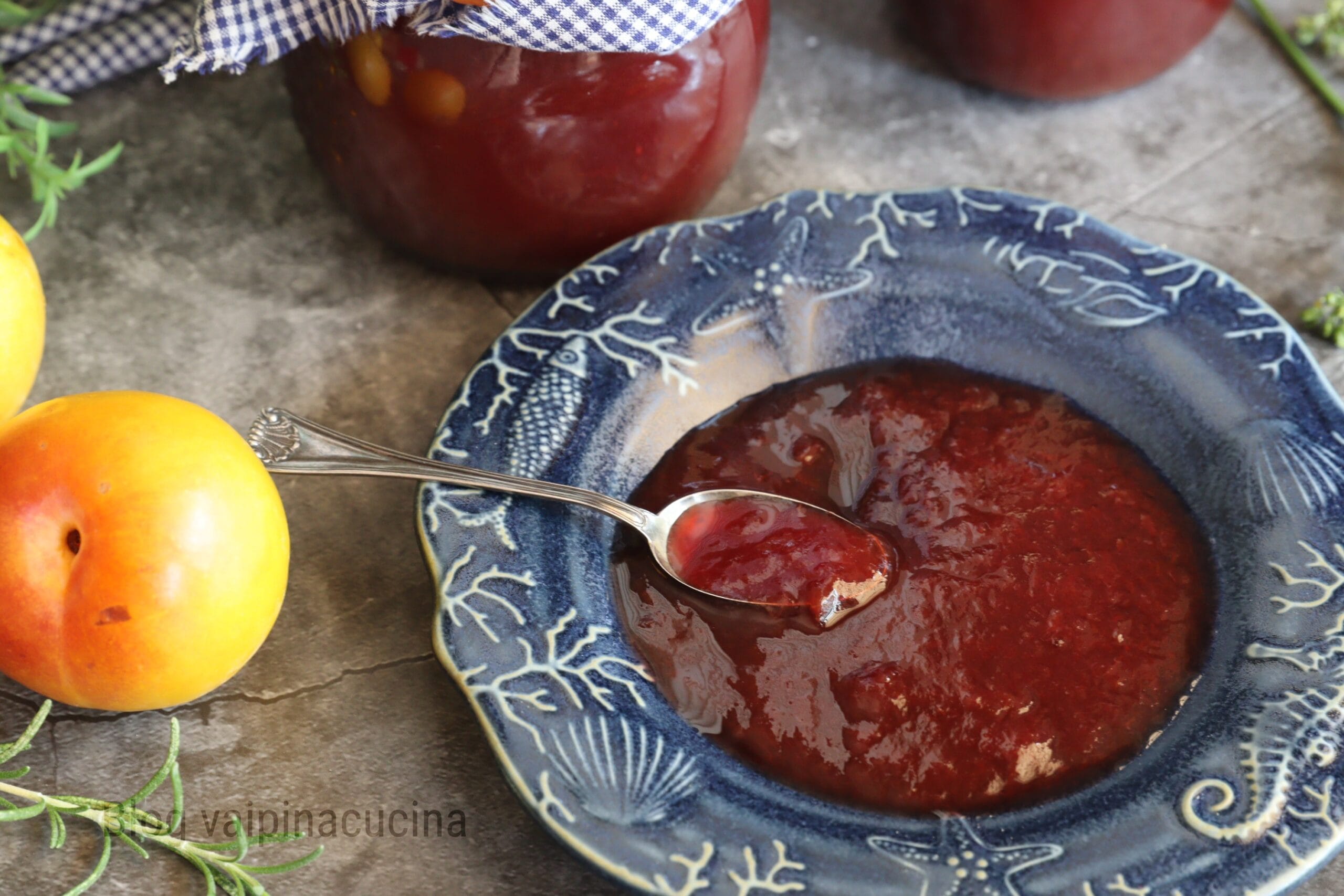 Geleia de ameixa na slow cooker: foi muito fácil prepará-la e nem te conto o aroma delicado que inundou a casa durante aquelas 8 horas de cozimento lento. Vocês já tentaram preparar pratos com esse sistema simples de cozimento lento e sem esforço? Quanto às geleias, então, você não precisa ficar mexendo o tempo todo para não grudar, o que é realmente maravilhoso: você não espirra açúcar por toda a cozinha. Fiz 4 potes de geleia de ameixa, dois potes pequenos de 250 gramas e 2 um pouco maiores de 300 gramas, um pequeno estoque para o inverno quando eu quiser preparar uma torta.